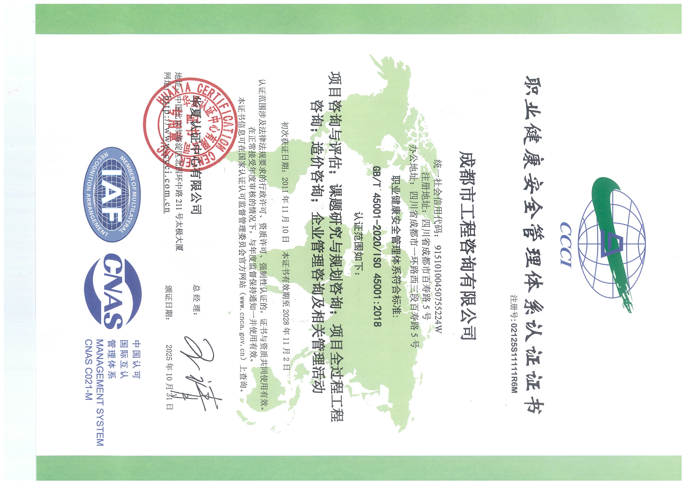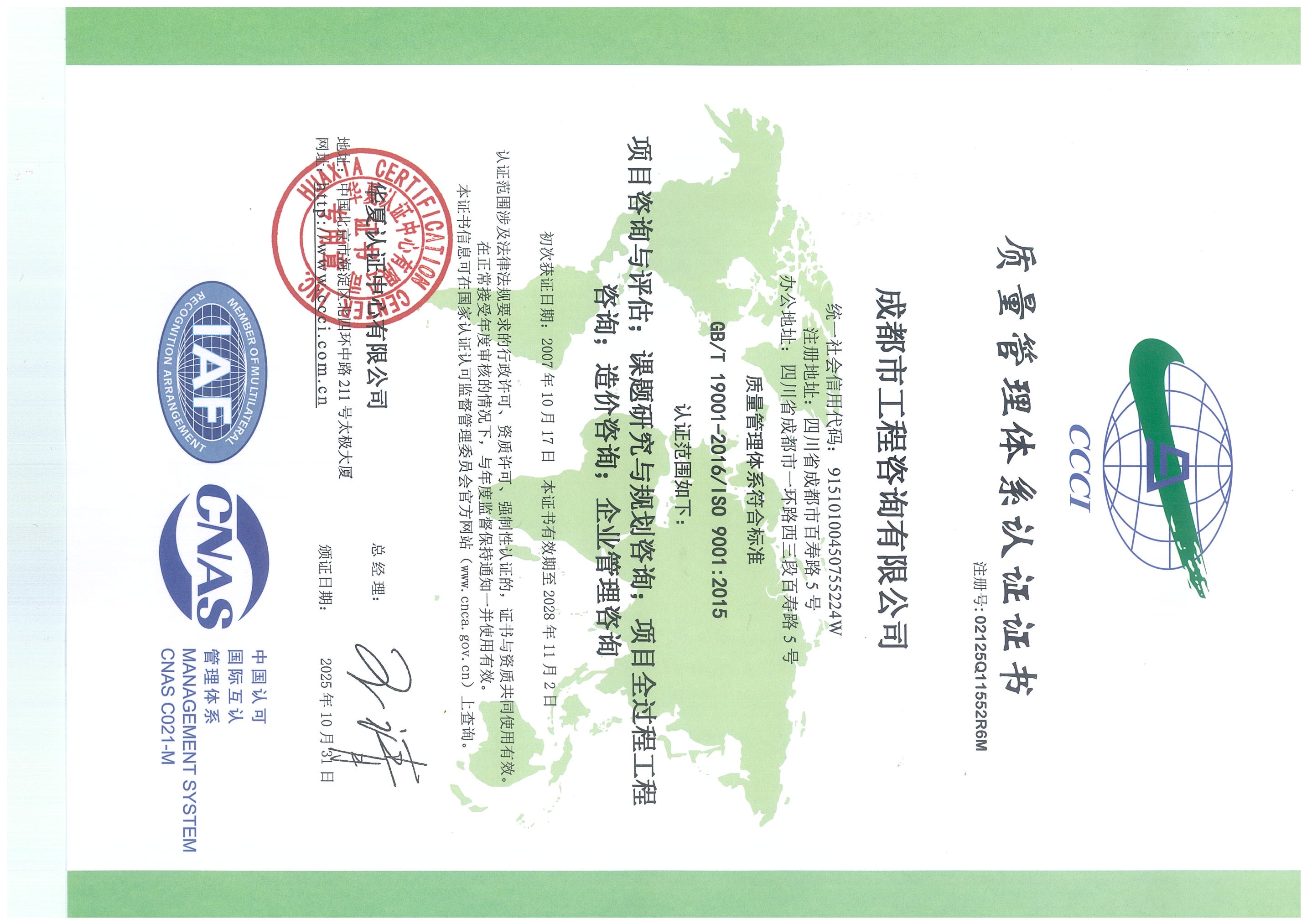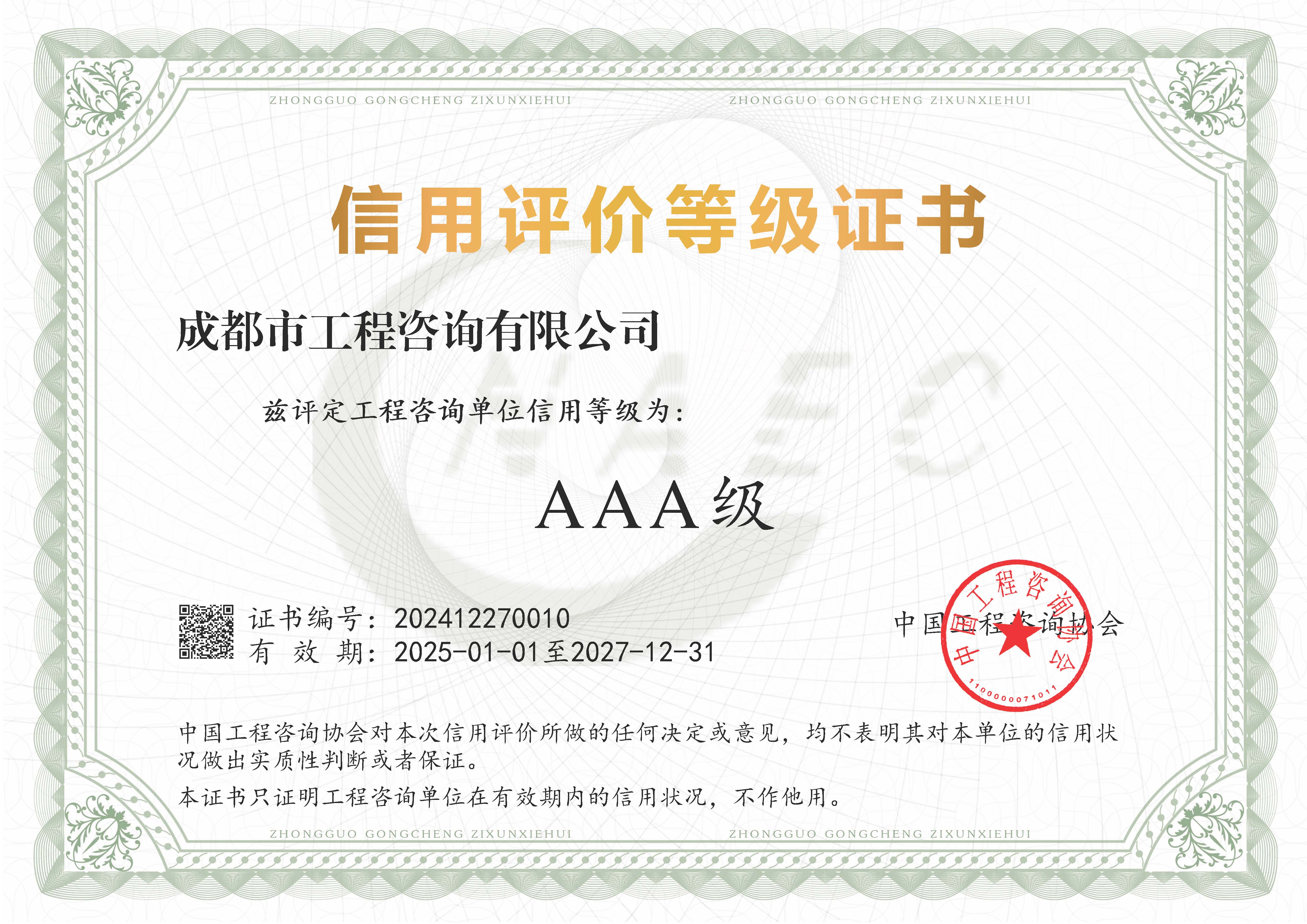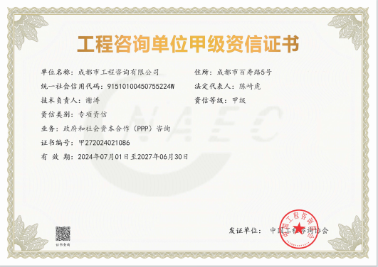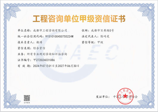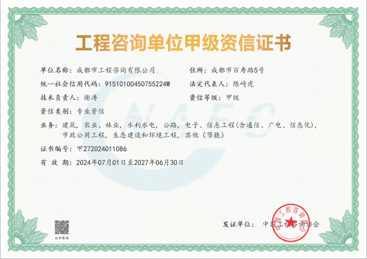 公司是四川省內唯一同時持有甲級綜合資信、甲級專業(yè)資信和PPP甲級專項資信證書的綜合性咨詢機構,是四川省及成都市發(fā)展改革部門以及天府新區(qū)、東部新區(qū)、高新區(qū)、武侯區(qū)等20余個區(qū)(市)縣的政府投資項目咨詢服務機構。公司擁有工程咨詢甲級綜合資信、甲級專業(yè)資信和PPP甲級專項資信三項甲級資信證書和工程造價資質。甲級綜合資信由建筑,水利水電,農(nóng)業(yè)、林業(yè),電子、信息工程(含通信、廣電、信息化),市政公用工程,生態(tài)建設和環(huán)境工程,公路,其他(節(jié)能)8個甲級專業(yè)資信和電力(含火電、水電、核電、新能源),輕工、紡織,水文地質、工程測量、巖土工程,建材,鐵路、城市軌道交通,其他(土地整理)和其他(旅游工程)7個其他專業(yè)組成。公司現(xiàn)已通過了GB/T19001-2016/ISO9001:2015質量管理體系、GB/T24001-2016/ISO14001:2015環(huán)境管理體系和GB/T45001-2020/ISO45001:2018職業(yè)健康安全管理體系認證。
