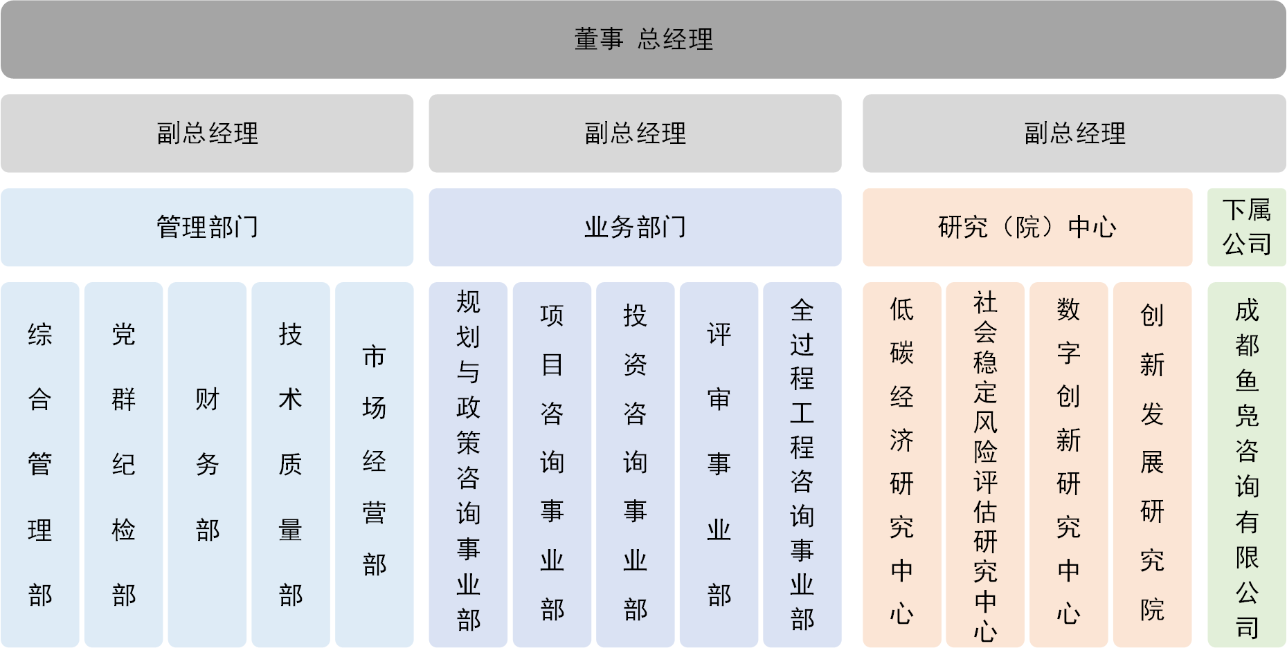 公司本科及以上學歷員工占比93%,碩士及以上學歷員工占比47%;正高級工程師7人,高級工程師28人,擁有全國咨詢工程師(投資)、全國注冊造價工程師以及注冊城鄉(xiāng)規(guī)劃師等各類專業(yè)技術資格人才占比超過65%。公司下設10個部門,4個研究(院)中心。其中,業(yè)務部門5個,包括規(guī)劃與政策咨詢事業(yè)部、項目咨詢事業(yè)部、投資咨詢事業(yè)部、評審事業(yè)部、全過程工程咨詢事業(yè)部;4個研究(院)中心分別為低碳經(jīng)濟研究中心、社會穩(wěn)定風險評估研究中心、數(shù)字創(chuàng)新研究中心和創(chuàng)新發(fā)展研究院。為推動行業(yè)數(shù)字化、智能化轉型發(fā)展,公司還與西南交通大學經(jīng)濟管理學院共建工程咨詢智能決策研究中心和產(chǎn)學研合作示范研究基地。公司現(xiàn)有控股子公司1家,為公司與溫江區(qū)屬國有公司合資成立的成都魚鳧咨詢有限公司。