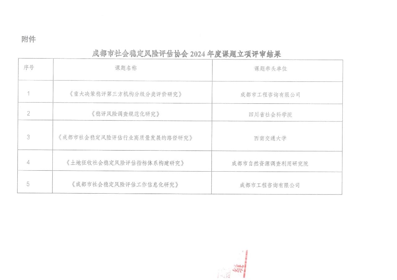 按照成都市社會(huì)穩(wěn)定風(fēng)險(xiǎn)評(píng)估協(xié)會(huì)《關(guān)于開(kāi)展2024年度課題研究申報(bào)工作的通知》要求,經(jīng)會(huì)員單位申報(bào)和專(zhuān)家組評(píng)估,擬對(duì)《重大決策穩(wěn)評(píng)第三方機(jī)構(gòu)分級(jí)分類(lèi)評(píng)價(jià)研究》等5個(gè)課題進(jìn)行立項(xiàng)。