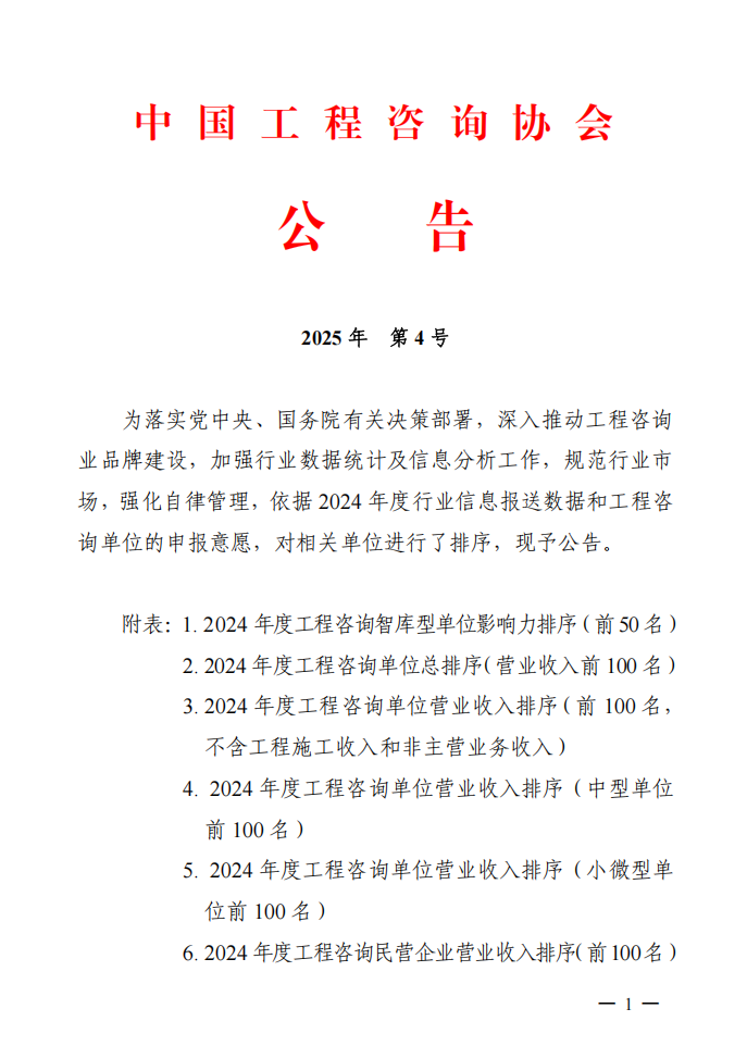 近日,中國(guó)工程咨詢(xún)協(xié)會(huì)公布了“2024年度工程咨詢(xún)行業(yè)智庫(kù)型單位影響力排序(前50名)”名單。成咨公司首次入選榜單,位列第46位。